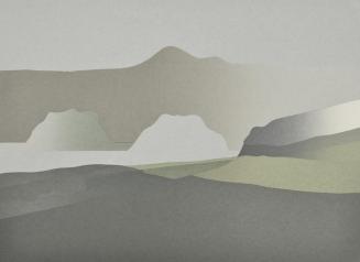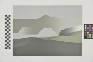 DescriptionBrown mountain background; Green and grey shore line in foreground; In middle ground is body of water with two green,grey islands in it