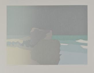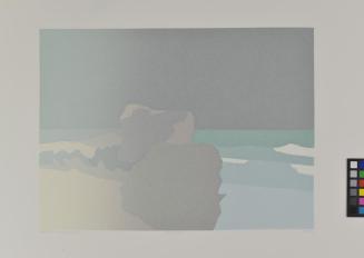 DescriptionIn left foreground are large rocks resting on a beach; Surf rolls in at right foregroundStatus