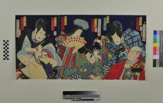 Descriptiontriptych; six figures in Kaubki costumes; the two figures in the left panel seem to be playfully struggling in order to dab each other with the paint laden brushes each of them holds; in the middle panel, one figure holds a fan partly covering his/her face while the other tries to avoid being dabbed with paint laden brushes; in the right panel, both figures hold a brush and ink container; one of the figures tries to dab the actor in the middle panel with his brushStatus