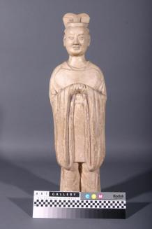 Descriptionstanding male figure wearing a long robe & court hat; hands clasped to chest; ; straw glaze with some red pigment in sleeve areaStatus
