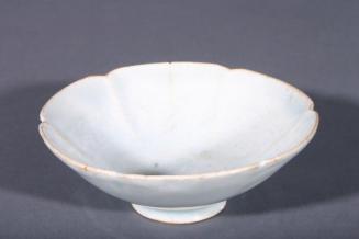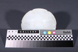 Descriptionpale green-blue bowl with widely scalloped rim & short base rim; interior of bowl has faint pattern in white which appears raised, but isn'tStatus