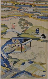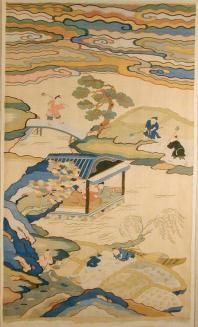 DescriptionPeasants are shown ankle-deep in water, planting rice, while behind them Literati gentlemen engage in conversation in a pavilion.Status