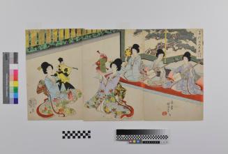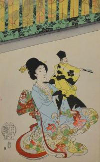 Descriptionsingle triptych component; A lady kneeling on the floor has a puppet dressed in yellow & black on her hands. Probably part of a Triptych.Status