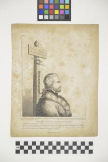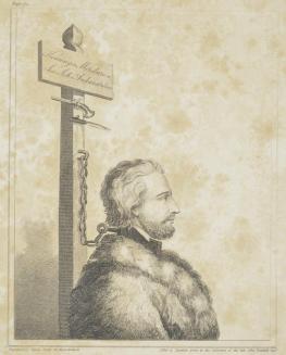 Descriptionbearded male chained by neck to posttortured and executed for the assassination of King Gustavus III of Sweden in 1782.