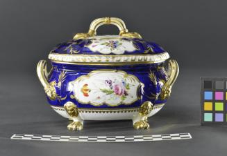 Descriptionsmall, two-handled tureen is white with a painted blue ground on the upper three quarters of its surface in which gilt cartouches frame two mirror-shaped reserves containing delicately-painted polychrome floral sprays. Gilt decoration is interspersed between the two reserves, and forms a border around the lower belly of the tureen. Base has four 'lions' feet, and above each foot is a moulded lion's head painted with gilt. These occur again on either end of each handle, which is striped with gilt trim; also on lid handle. Lid has blue ground with three reserves, also containing polychrome floral decoration, and trimmed with gilt cartouches. Moulded rim remains whiteColour: white; royal blue; gold; pink; purple; faded green-blue; yellow