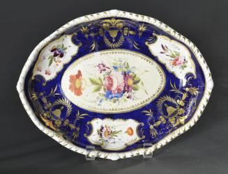 Descriptionoval dish has blue ground with three mirror shaped reserves in gilt C scroll cartouches around a large central oval with a gilt dentil border, all containing delicately painted polychrome floral sprays (larger bouquet in central reserve); gilt decoration (hanging baskets) also on blue ground between reserves; twelve sided rim has moulded edge trimmed with shell motif and giltColour: white; royal blue; gold; pink; purple; green; yellow; orange; blue
