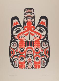 DescriptionSplit image design of beaver holding stick and human figure (superimposed) in tail. The bold heavy form lines of the beaver contrast with the fine flaring almost skeletal form line of the human figure in tail. The beaver is identifiable through the "buck teeth", the stick which it holds, and cross-hatching on the tail. The "human" figure in the tail, characterized by the 5 figured hands, ribcage, and body shape, indicates a transformation between animal and human or supernatural being. The three faces at the being's head (resemble) a 3-tiered woven 'chief's hat', which is said to indicate the number of potlatches given, but more generally may indicate chiefly statusStatus