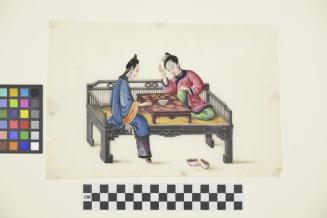 DescriptionTwo women, one Manchu and one Han Chinese are playing with fortune sticks on a small table on a bed. The Han woman has bound feet and the Manchu woman has elevated shoes. (Each painting in the set illustrates a different game being played)Status