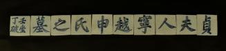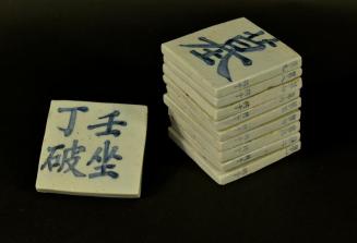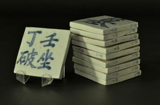 Descriptionone of a set of tiles identifying a tomb occupant; mainly with single characters listing man, wife and date; characters rendered in cobalt blue underglazeStatus