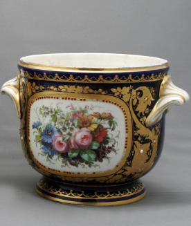 DescriptionJewelled SevrÞ-style cooler with two shell-like handles and a raised foot. There is a scene depicting a man and a woman with a dove and a wooden box (cage?) on one side and a flower bouquet on the other side, each enclosed in a jewel embellished and gilt cartouche. The bright blue background is a decorated with gilt patterns and jewels.Status