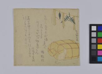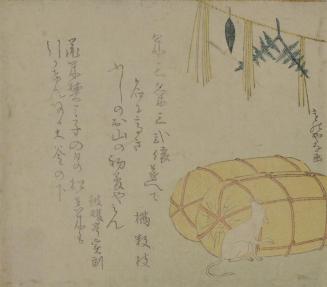 DescriptionImage of two straw bags and a mouse with Japanese characters at left.