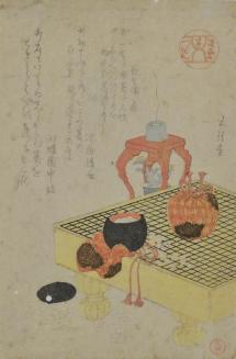 DescriptionImage is of a set up for a Go game with a board and containers of pieces. Japanese characters at top left.Status