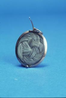 Descriptionoval shaped portrait of grey haired man in red jacket; this is set in a metal (gold?) case with a hinged pin at the back & a jump ring at top; the back is filled with a braided pattern of human grey hair & covered with glass; the portrait is also enclosed in glassStatus