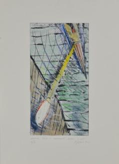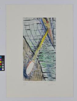 Descriptionship amidst stormy waves; yellow mast pointing towards the viewerColour: brown; green; blue