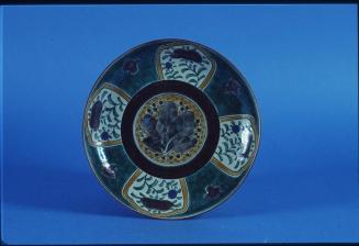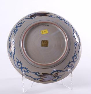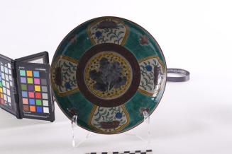 DescriptionOne of a pair of Kutani shallow dishes decorated in overglaze enamels with central leaf pattern in underglaze greyish blue on a yellow and grey patterned background surrounded by a key fret pattern border in aubergine and black, around which are four panels of flowers and leaves in similar overglaze enamels on a background of green with a black karakusa design and aubergine flowers. The underside of the rim with overglaze blue scroll pattern and two brown enamel sheaves and two small brown enamel marks.Colour: blue; multi-colour