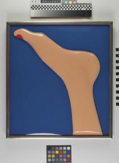 DescriptionFormed high relief image of an upside down flesh coloured foot with a red toe nail, on a blue backgroundStatus