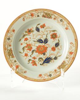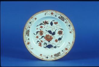 DescriptionImari style; chevron rim; floral & leaf pattern on rim & in well; in reds, blues & giltStatus