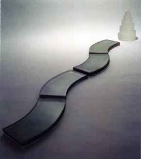 Descriptiontwo components: spiral cone & meandering path of 4 flat sections; spiral is of translucent clear glass with a smooth mat texture on exterior; meander is darker glass;