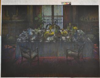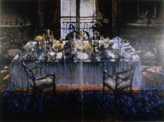 DescriptionImage consists of 28 panels mounted in a grid and depicts the interior of a house with a large table covered with dishes and the remains of dinner. There is a window in the backgroundColour: multi-colour