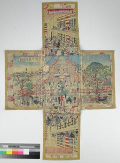 Descriptionportfolio made from woodcut and lithograph prints mounted to lightweight cardboard and designed for a dealer to carry prints; four sides fold over each other to create an enclosed folder; exterior features a woodcut triptych of people arriving at a fine Western-style stone building decorated with Japanese flags and red paper lanterns. Some of the guests wear traditional Japanese dress while others wear European fashions, including full bustled skirts and top hats. The exterior also features two panels from another woodcut triptych showing people seated inside a building on the main floor and in a balcony. The inside of the portfolio includes offset lithographs of two beatuies and two Lucky Gods scenes.Status