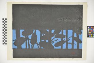 Descriptionblack trees on green background; self carved and self printed by artistStatus