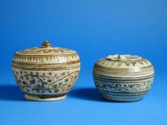 Descriptionpersimmon shape; dark brown trailing nine decoration, bands; areas of blue glaze; frog? knob; concentric circles; scalloped inner form, lidColour: brown; beige; blue