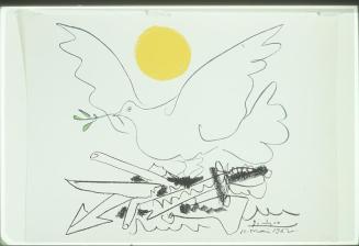 Descriptionprint depicts a dove carrying an olive branch in it's beak; overhead is a yellow sun