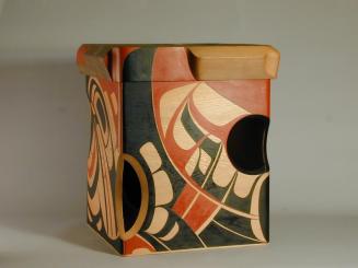 Descriptionbentwood box with lid & mask attached inside & viewing cutouts; each side is carved & painted in black & red with blue outlining; the mask inside is of natural wood with blue detail