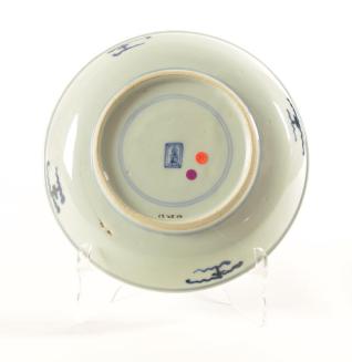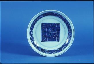 DescriptionBlue and white shallow dish decorated in the well with a tao tieh mask in underglaze blue. Deep blue band of karadusa and flower petals around the rimStatus