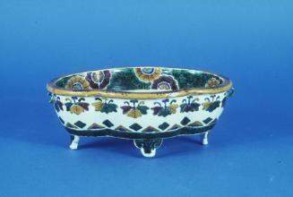 DescriptionCenser is supported on four small feet, quatrefoil body painted in yellow, green, aubergine & blue overglaze enamels, in the centre with a panel of two carp among weeds, below a border of flowers. The exterior with a band of leaves in yellow, aubergine, green and blue, and a band of green with black tendrils around the bottom. Fuku mark on the base in yellow and aubergine.Colour: yellow;green;blue