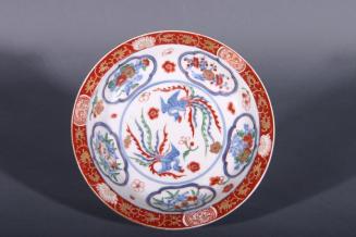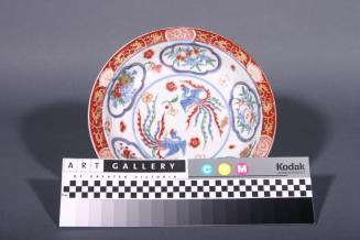 DescriptionOne of a pair of Kutani/Kaga dishes with high footrims decorated in underglaze blue and overglaze enamels. Central panel of 2 Ho-Ho birds with flowers, and 4 panels of flowers and leaves in the cavetto. The flat rim decorated in red and goldleaf scroll interspersed with 3 Buddhist lion heads and 3 flower heads. Under the rim with 2 Ho-Ho birds in overglaze enamels and flowers. The high foot with underglaze blue band of karakusa and flower design interspersed with 3 rouge de fer panels of floral design.Status