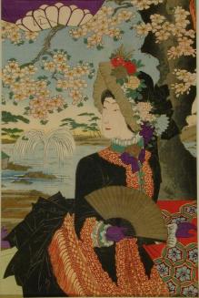 DescriptionJapanese Empress wearing a western style dress with bustle & a western style bonnet decorated with chrysanthemums & other flowers; she is holding a fan; water & a fountain in the backgroundStatus