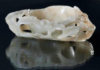 DescriptionPiece consists of a central bowl shaped like a flower with a raised criss-crossed centre and incised radiating petals. There are carved and pierced branches with blossoms and leaves surrounding the exterior of the bowl.Status