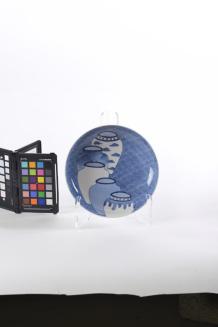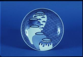 DescriptionNabeshima underglaze blue and white dish decorated with five jars, each with different decorative pattern, on blue and white wave background. The underside of the rim with 3 cash and ribbon patterns, each with 6 medallions. Comb pattern in blue around the high slightly tapered foot.Colour: blue;white