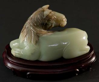 DescriptionJade figure of a horse lying down with it's front legs folded under, head turned to look over it's back, tail curved around to the side and ears bent forward. Horse is carved in pale green jade with incised details, some pigmented with brown.Status