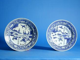 Descriptionone of a pair of blue & white plates painted with ducks in a landscape mirrored with swallows in flightStatus