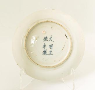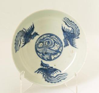 Descriptionblue & white saucer dish with central phoenix medallion encircled by 3 more phoenixStatus