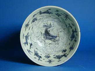Descriptionblue & white bowl decorated in the well with a carp among wave scrolls. The cavetto has five carps interspersed with cross & scroll motifs above a band of waves. Decorated outside with lotus flowers & leaf scrolls.Status