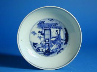 Descriptionone of a pair of blue & white saucer dishes each decorated with a lady in a pavillion & a small boy gesticulating.Status