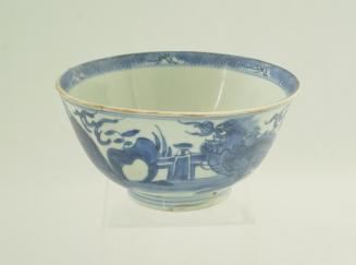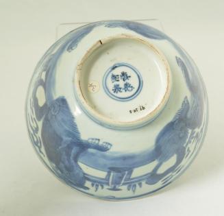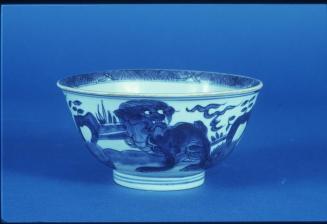 Descriptiontransitional blue & white bowl decorated with hare in the well and with buddhist lions outsideStatus