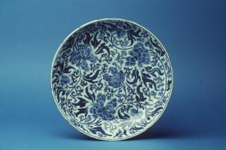 Descriptionlarge blue & white saucer dish decorated with an overall design of peony flower scrolls