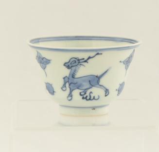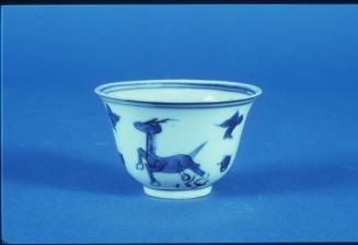 Descriptionone of a pair of transitional blue & white wine cups each decorated outside with 3 running horses separated from each other by a flower and a round medallion; the well has a rock form within a double blue ringStatus