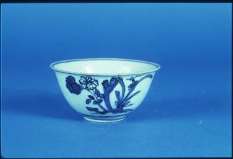 Descriptionblue & white bowl decorated in the well with 2 peaches & outside with 2 sprays of flowers.Status
