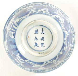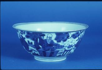 Descriptionblue & white bowl decorated with the Eight Immortals on the exteriorStatus