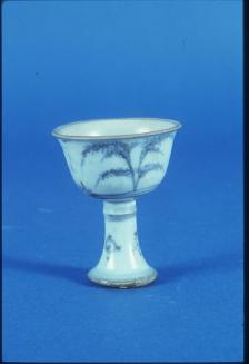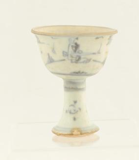 Descriptionblue & white stem cup decorated with a freely drawn scene of a man fishing & a pine tree; in the well a fly? is depicted within a double blue ring