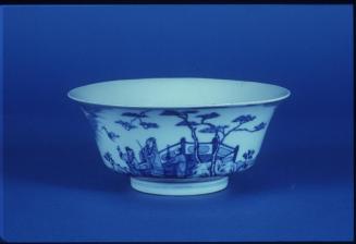 Descriptionblue & white bowl decorated outside with the scene of a dignitary on a terrace attended by a youth talking to a servant under a pine tree. The servant is pointing to a crane flying past with grass in its mount. It is flying twoards a house by the water. There are rocks & a pine tree in the backgroundStatus