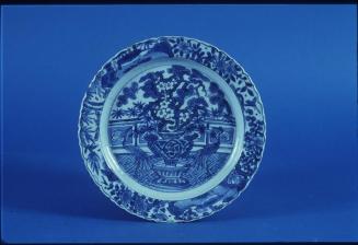 Descriptionblue & white dish with foliate rim decorated in the well with 2 cranes in the courtyard, one on each side of a large vase out of which grow pine, prunus & bamboo. The broad rim is decorated with birds, a hard & a snake among prunus & bamboo & chrysanthemum flowers. Under the rim & outside the cavetto there is decoration of birds in flight & on branches.Status