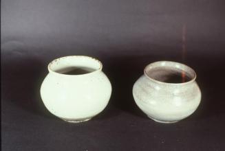 Descriptiongreyish-blue rounded pot with wide mouth with a slight lip at neck. Sits slightly assymetricalColour: grey-blue