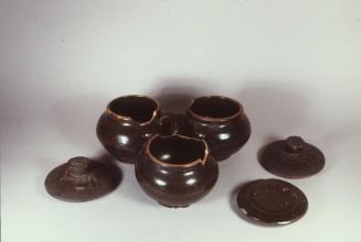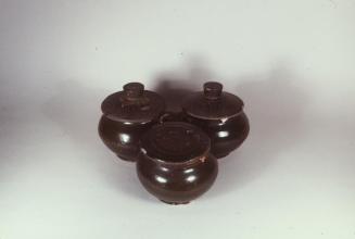 DescriptionTriangular group of 3 pots joined on the sides with a raised bridge. Each pot has a lid and a small base.Status