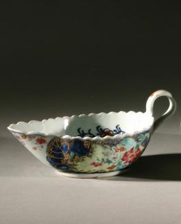 Descriptiongravy boat with scalloped rim; leaf and floral design on exterior; flower and branch design on interior of boat